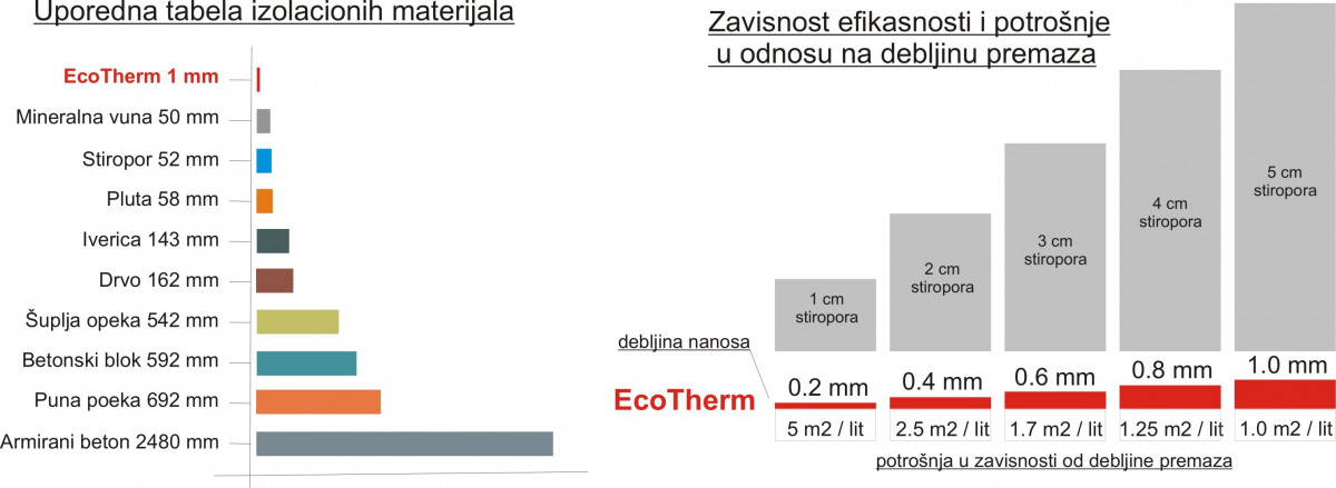 (20-40 mikrona) koje imaju izuzetna termoizolaciona i reflektujuća svojstva ( 1mm PREMAZA ZAMENJUJE OK 5cm STIROPORA kao izolatora odnosno 16cm DRVETA). Više tehničkih detalja saznajte u odeljku "DETALJNIJE"